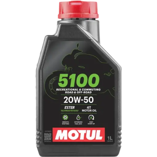 Масло MOTUL 5100 4T 20W50 1L е 4T двигателно масло за мотоциклети, което отговаря на очакванията за надеждност за ежедневна употреба и развлекателни дейности. Подходящо за всеки тип уличен или офроуд мотоциклет с 4-тактов двигател, с или без интегрирана скоростна кутия, мокър или сух съединител.