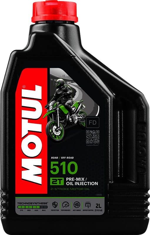 Масло MOTUL 510 2T 2L е смазочно масло, специално разработено за двутактови мотоциклетни двигатели по технологията Technosynthese®. Осигурява защита на двигателя. Съвместимо с всички видове бензин. Противодимна формула. Подходящо както за системи с маслен инжектор, така с и за премикс. Съвместимо с каталитични конвертори.