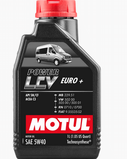 Масло MOTUL POWER LCV EURO+ C3 5W40 1L 106131 e Високоефективно 100% синтетично – двигателно масло ESTER, вдъхновено от конкуренцията и специално проектирано за бензинови или дизелови двигатели, настроени или високопроизводителни, с атмосферно пълнене или турбокомпресор, индиректно или директно впръскване и работещи в широк диапазон от обороти и температури на двигателя, в най-тежките пътни или състезателни условия.