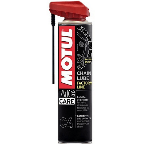 За всички видове вериги: стандартни и с O-RING, X-RING, Z-RING. Резултат от опита на Motul в мотоциклетните състезания, само за шосейна употреба (лепкав продукт), Бяла грес спрей за верига Motul C4 CHAIN LUBE е лубрикант , специално разработен за смазване на вериги на състезателни мотоциклети : Road Racing и ендуро. Специално